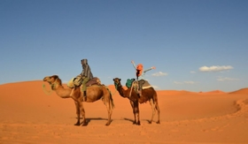 After breakfast, we start our Morocco Tour with a visit to the Todra Gorge, which climbs to 300 meters in a tiny valley. After lunch in the gorge, we will go to Erfoud and maybe visit the fossil factory before continuing on to Rissani to explore the local souk. We then arrive in Merzouga, Sahara desert. We'll ride camels into the breathtaking Sahara desert dunes and sleep in desert tents.