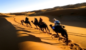 Today our Morocco Tour continues and we will explore desert are . We ride camels and we reach the dunes of Erg Chebbi ,highest in Morocco. We will also visit a Berber family and also Khamlia village ,where we listen to Gnawa music. We will visit Berber nomads and oasis of palm trees in nearby area. After lunch in Merzouga we ride camels in the sand dunes to reach desert camp. We will spend this night in desert Sahara camp where we will enjoy Berber drums music in the middle of the Sahara. You will also enjoy the sunset and sunrise in desert. After traditional Moroccan dinner we stay overnight in desert tents.